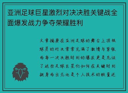 文章摘要:在亚洲足球的舞台上,顶级球员的对决常常充满了激情与紧张,而每一次决胜时刻的爆发更是见证了这些足球巨星们如何在关键时刻挺身而出。无论是个人技术的较量,还是团队配合的艺术,亚洲足球巨星的激烈对决总是令人热血沸腾。本文将从四个方面详细探讨这些巨星们在关键战中的全面爆发,以及他们如何通过无畏的战斗为荣誉而战,争夺最终的胜利。我们将从球员的精神状态、战术执行、技术展示和团队协作四个方面进行深度分析,力图为读者呈现出一场精彩绝伦的足球盛宴。